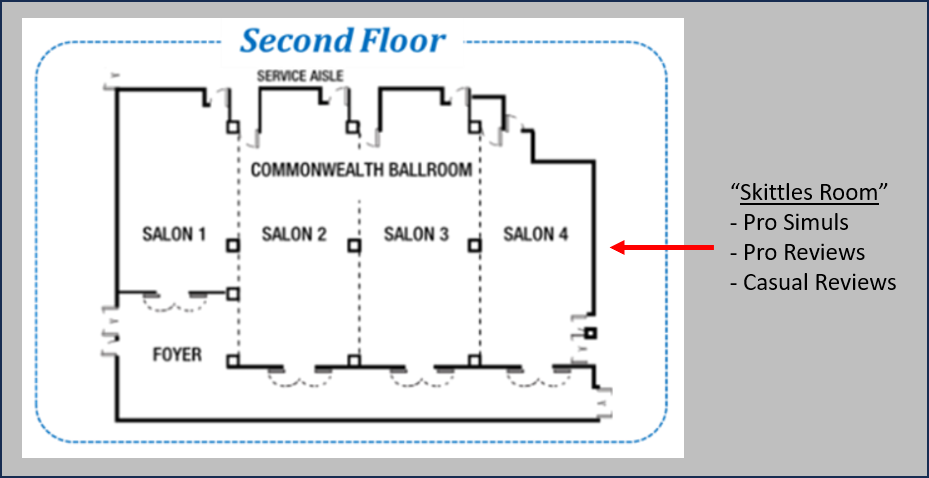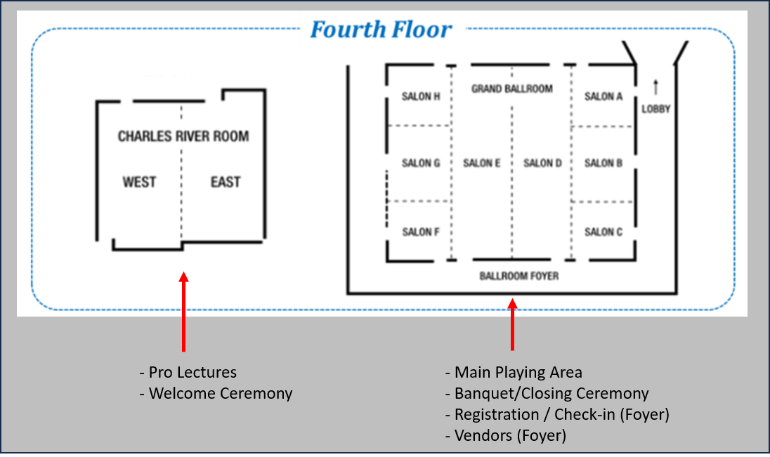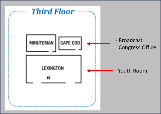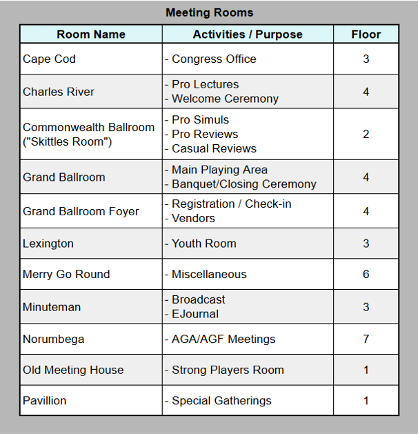 The table below lists the floor numbers for the rooms (listed in alphabetical order) where our activities will be held. The corresponding floor plans are shown after the table.