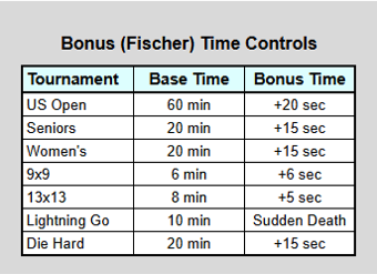 Most tournaments will use Bonus (Fischer) time controls (Lightning Go is one of the exceptions, which will use sudden death.) Bonus Time is a timing system where each player starts with a base amount of time, and gains additional (bonus) time after each move. Additional information on the Bonus Time system is given HERE .